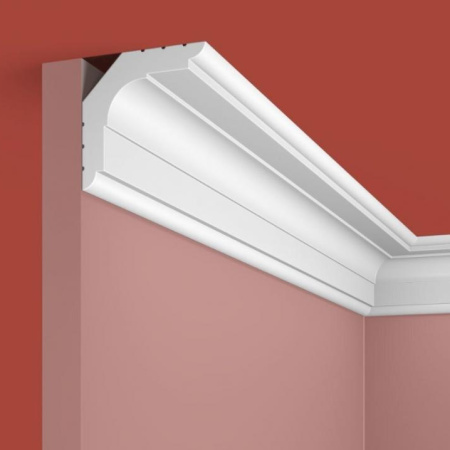 Карниз для скрытого освещения Cosca Decor изготовлен из ударопрочного экополимера – это композит с добавлением светостабилизатора. Материал изделия уже огрунтован в своей массе, благодаря чему его можно не окрашивать. Он сохранит белый цвет и не пожелтеет со временем. Красить также легко, с экономией на краске, так как грунтовка уже есть!