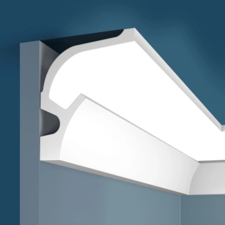 Современный строгий плинтус. Может также использоваться как аплайтер и даунлайтер. Используйте алюминиевую ленту на внутренней стороне профиля или алюминиевый профиль для светодиодов, чтобы свет не просвечивал сквозь молдинг.