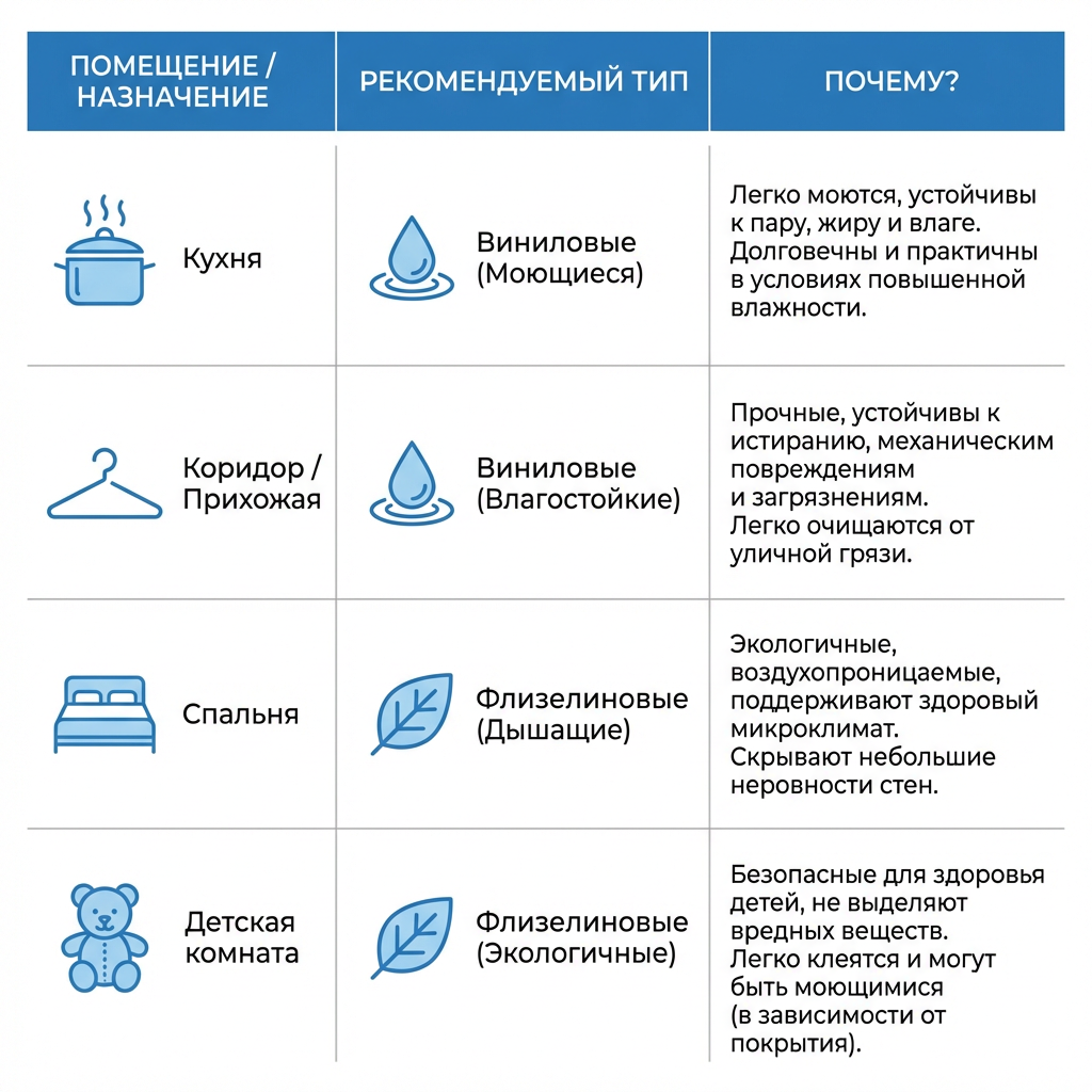 Проще запомнить: Винил — самый крепкий и практичный. Флизелин — экологичный и «дышащий».