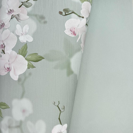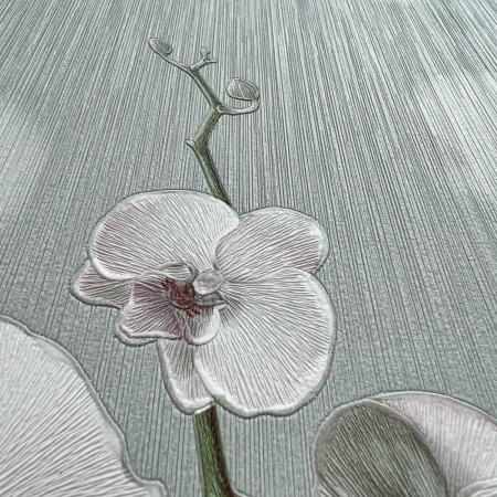 - Пятый сет выполнен в флористическом 3D-стиле и представляет собой шикарные ветви орхидей. За счет изображения высокой четкости, определенного нанесения текстуры на полотна обоев, на стене создается объемный эффект.